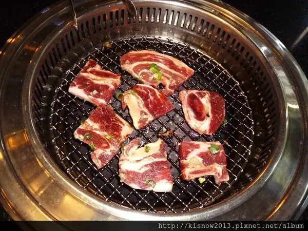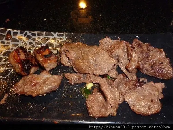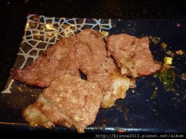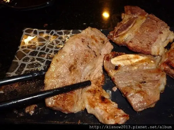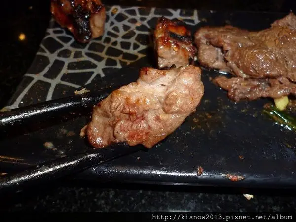 單骨牛小排切成片狀,明顯帶有骨頭,油花分佈鮮明,經過炙烤後吃起來的口感,肉質肥厚,油脂部份相當重,脂肪滋味很明顯,肉質具有相當大的韌勁,因為帶有骨頭,咬起來相當費勁,