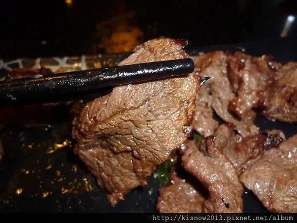 安格斯黑牛是薄片狀,油花分佈均勻,經過炙烤後,吃起來的口感薄嫩,帶有一點韌勁,在口中咀嚼,除了細膩的油香味,還帶有鮮美滋味.