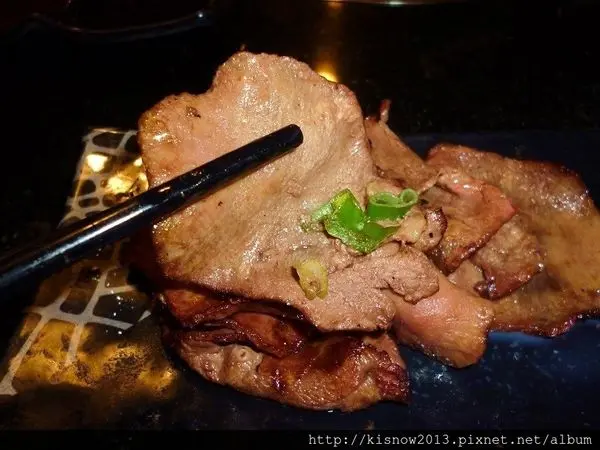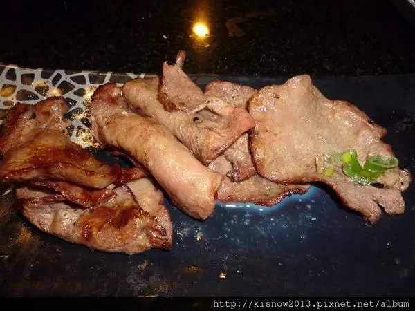 牛舌搭配青葱,經過火爐炙烤,外表呈現粉嫩的薄片狀,吃起來的質感柔軟,具有美味的油香和嫩度,油脂部份很少,質感不會偏柴,也不會偏硬,口感上相當完美.