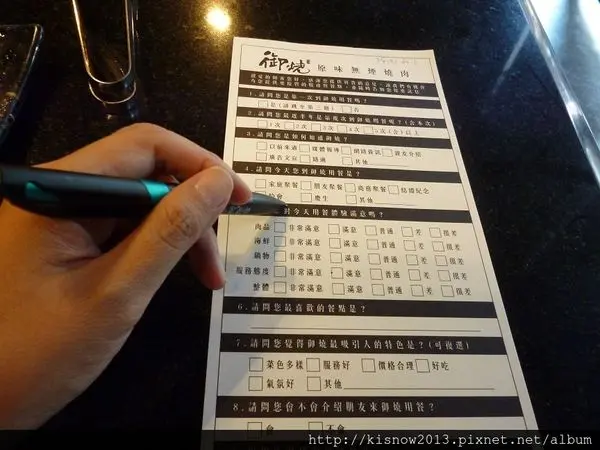 餐後服務人員送上問卷,在環境方面,店家把燒烤店的排煙管埋設在地下,減少室內70%至80%油煙,這次整個餐點体驗下來,只有接近烤爐的時候,感覺爐子比較熱,燒烤的時候有少許的油煙冒出來,但整体環境沒有感到有很重的油煙.至於服務人員態度上保持相當的禮貌,有提供火鍋料的桌邊服務,用餐途中也會隨時更換烤爐的濾網,避免網子太黑,烤出來的東西美味減損.