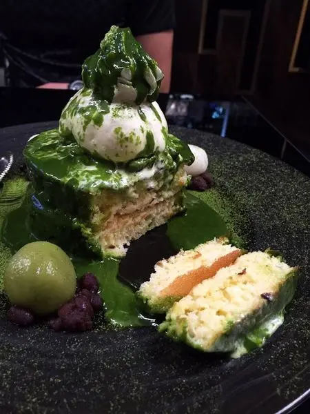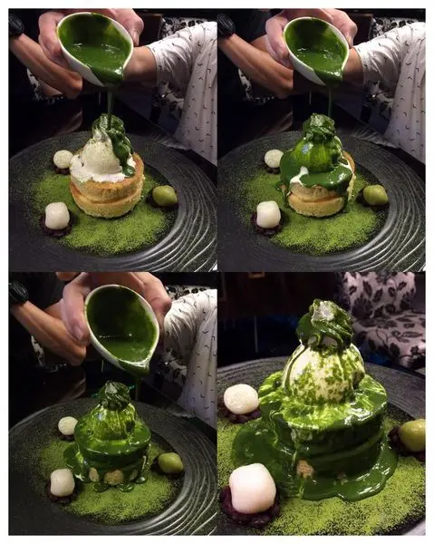 熱蛋糕搭配上方的冰淇淋和抹茶淋醬