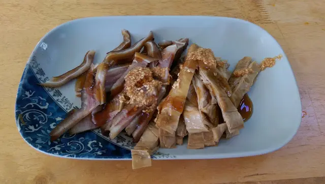 豬耳朵軟而微彈,豆包細緻散點豆香,油膏鹹中帶甘。小菜特