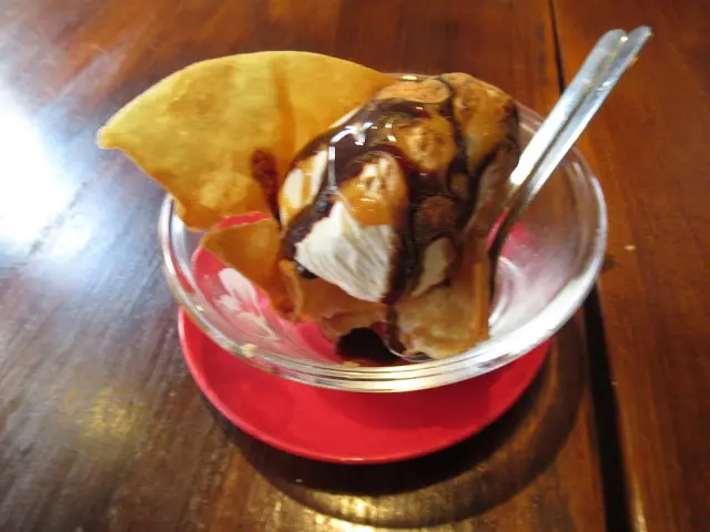 焦糖肉桂炸彈花上桌時完全出乎意料,是一球冰淇淋搭配酥餅。