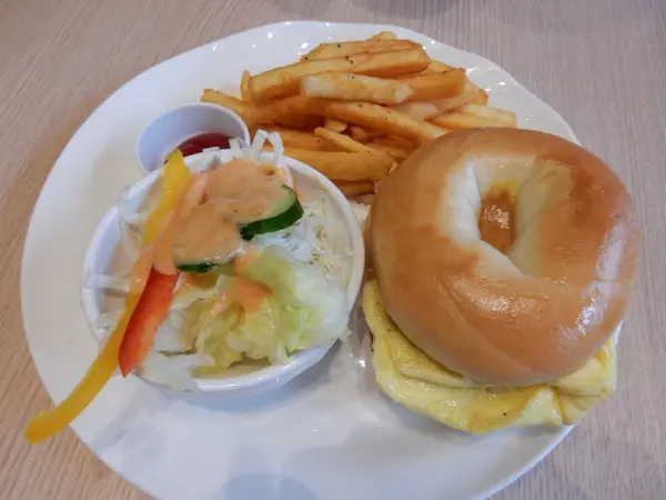 三明治改成貝果要加價二十元。餐盤上除貝果外,尚附有薯條和