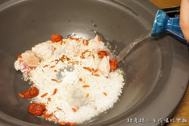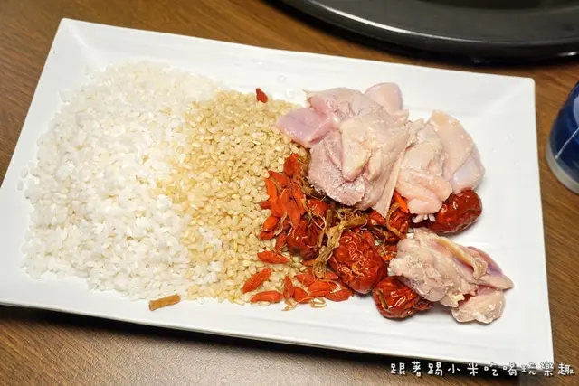 這是粥底養蔘紅棗雞肉粥食材, 有白米及糙米, 再加上其他食材看起來就很養生了~ 先讓店員放到蒸鍋底部, 之後會藉由蒸煮食材時流下來精華與米粒一起蒸煮, 留到最後嚐用一碗集各海鮮食材精華粥品~ 這樣就帶著滿意肚子回家了