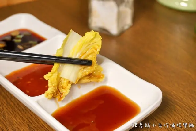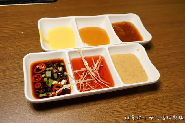 前面提到他們的醬料有多樣選擇, 小米建議可以多試幾種找自適合自己的口味, 特別提一下第2盤中間紅色是店家說的紅酒醋, 對小米來說跟港澳常吃的紅醋味道很像, 我們常用於沾螃蟹吃~