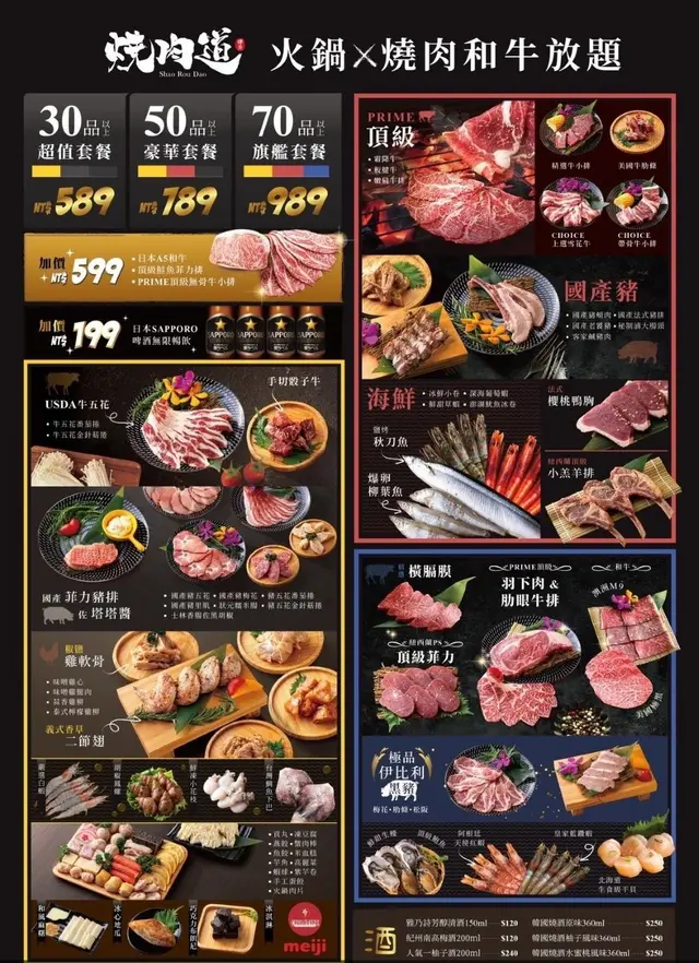 燒肉道提供三種吃到飽的價位(平日用餐只要$589+10%起)