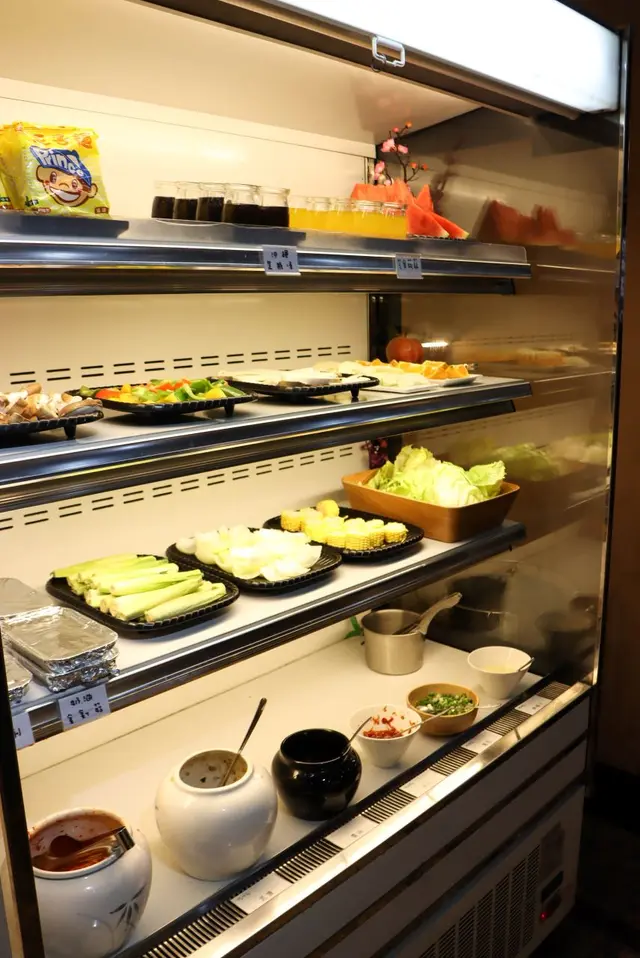 前面開放式冰箱中,提供生菜、韓式泡菜、蔥鹽等等可以拿來搭配烤肉一起食用