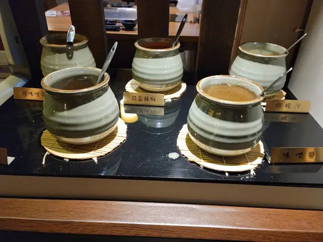 以飲料為主,種類不少。醬料檯有檸檬汁、味噌醬、照燒醬等