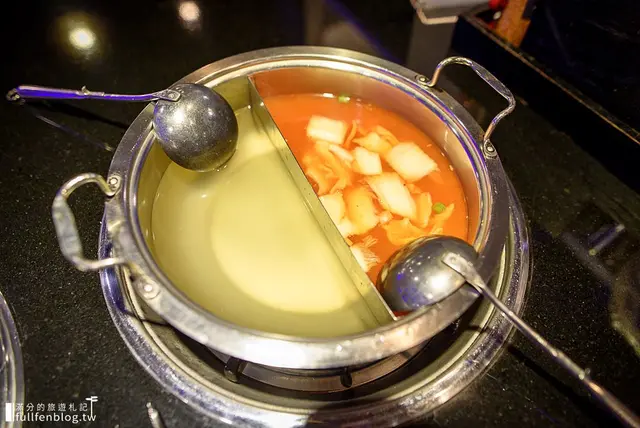 火鍋是鴛鴦鍋,有原味湯頭、泡菜和麻辣鍋可選擇