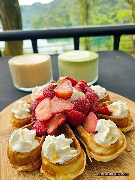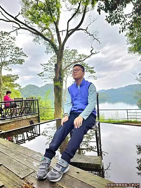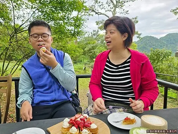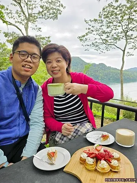 石門水庫周邊,有幾家景觀餐廳(咖啡廳),但之前我們都尚未造訪過任一家。會決定前往這家「水漾石門」,不是因為其人氣或評價是最高的(但也不賴),單純只是我覺得其價位很平價。在這,一邊飽覽水庫如畫般,湖光山色的靜謐絕美景色,一邊悠閒地喝下午茶與吃水果鬆餅,不僅母子倆開心的很(看照片笑容就知),且我們每人平均還花費不到2百元,我是覺得相當超值~