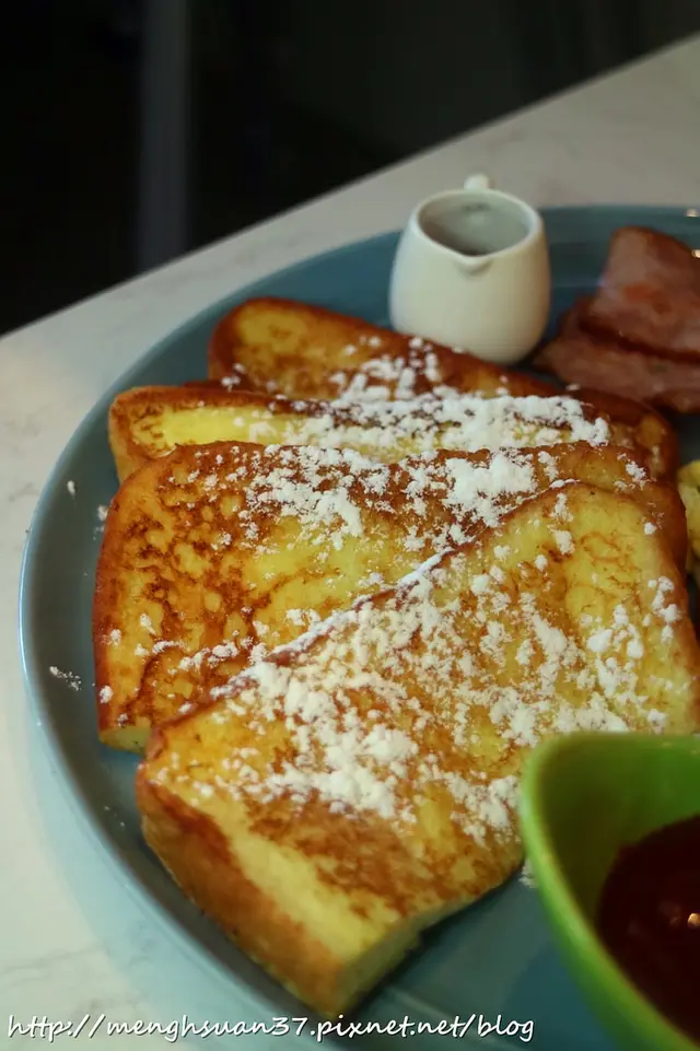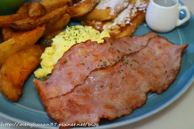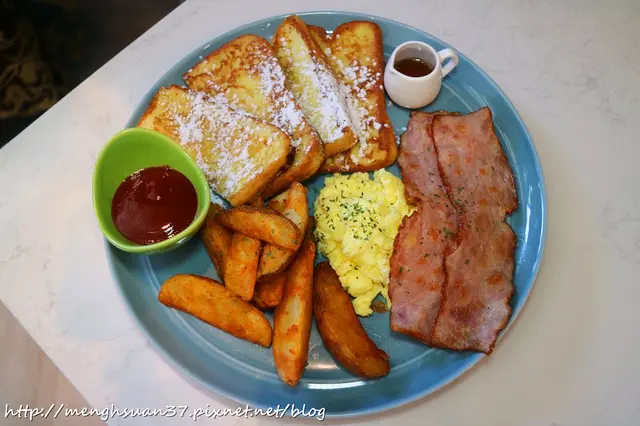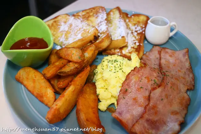 這款看起來就像是經典型擺盤的早午餐,現做的法式煎蛋吐司、特製炒蛋還有烤培根,早午餐的好朋友炸脆薯也是不可或缺的!挺澎派的。