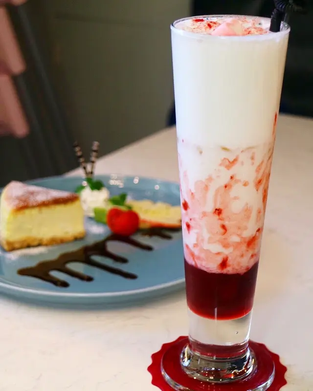 這杯一上桌我們都驚呼「太美了吧!」聽闆娘說這裡頭的草莓果醬是他們自己做的,還吃的到草莓果粒,真材實料!搭配上鮮奶,少女系夢幻飲品誕生。