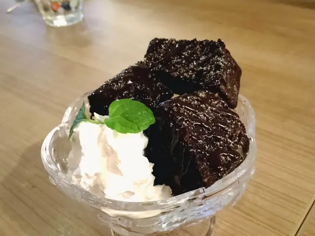 朋友點的布朗尼,黑嘛嘛的布朗尼裝在高腳容器內,加點奶泡與薄荷做點綴,外觀上很討喜。