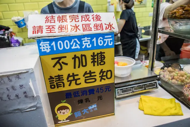 夾好料就去旁邊秤,秤完再去對面櫃檯加剉冰,這裡是100克16元低消45元,幾乎每個人都是夾到破百,哈哈哈