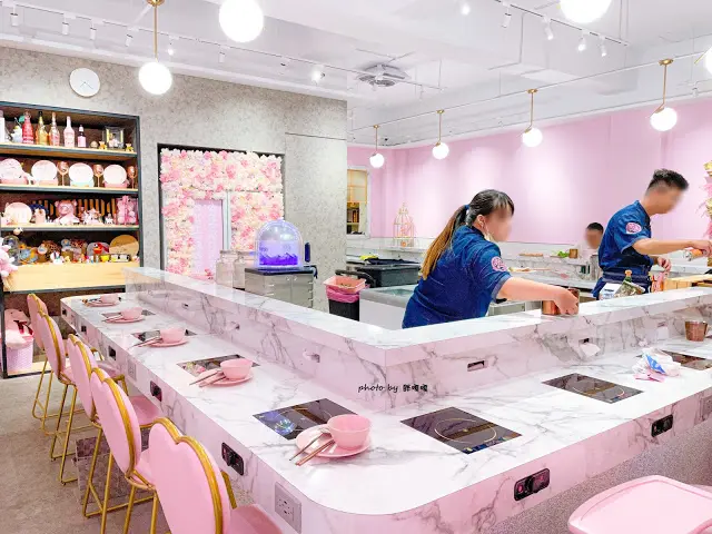 每次經過咾鍋都會想這家店怎麼這麼浮誇整間店粉嫩到不行有好幾回都想走進來終於最近地方媽媽群組有小優惠於是工作結束就決定是這家啦!!!整間店非常吸睛我們當天距離訂位時間有稍微提早到瘋狂媽媽馬上就在外頭先拍一波實在是太美了!!怎麼拍怎麼好看啊!!進入店內明亮的燈光搭配粉紅、玫瑰金令人眼睛為之一亮特別的是咾鍋只有吧台座位座位數不多,但服務人員可以完全照顧到每一位客人就連餐具、紙巾都是粉紅色 菜單服務人員很用心講解菜單內容接著會倒上一杯招待的無酒精香檳每位來賓都有無酒精開車也不用擔心^^超誇張!就連兒童座椅都是粉紅色!!我真的是跪了泡泡很開心自己也有一個位置醬料區佈置得也很美提供10種不一樣的選擇愛怎麼調就怎麼調醬料碟就放在剛剛醬料區的櫃子下面很好看的金色和整家店的風格一致這巧思實在令人佩服剝皮辣椒鍋 $488店內三大招牌之一凡點這系列都會搭配十八養場的紅玉雞肉有半隻雞腿肉和鮮嫩雞柳搭配的菜盤擺盤很美,份量還好,不算多我們主食都選白飯十八養場的紅玉雞肉因為是吃紅茶長大所以肉質本身就粉嫩粉嫩服務人員解說道不得不說這雞肉實在軟嫩好吃久聞紅玉雞大名這還是頭一次吃到果然名不虛傳啊!!吃完這餐我就決定一定要自己買回家料理實在太好吃了這個雞肉鮮嫩雞柳已經先調味好一樣軟嫩好吃只是不像我們印象中的雞柳有點像雞肉泥西班牙伊比利豬(琥珀昆布湯底) 8盎司 $438咾鍋的鍋物在肉品上有5盎司和8盎司可做選擇豬肉片軟嫩好吃就連小泡泡也吃了3-4片而且沒有豬腥味這點我最在意了!不過肉真的很薄嘎吃完直說好空虛琥珀昆布湯底相當濃郁我自己覺得口味有稍微重了一點湯底的口味可以請服務人員調整但因為我不怎麼喝湯所以就沒調整愛喝湯的朋友可以試試看,調濃調淡都可以點伊比利豬就有炙燒服務服務人員會拿2片豬肉片做炙燒中間夾泡菜軟嫩的伊比利豬搭配爽脆口感的泡菜真的很好吃除了中間包泡菜上頭有一個是搭蒜片一個是起司兩種我都很喜歡