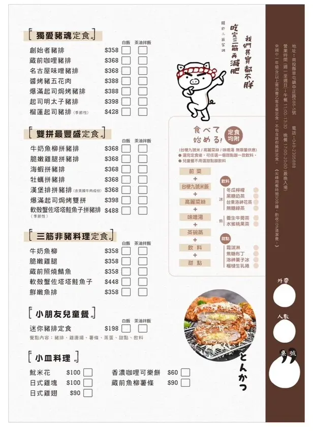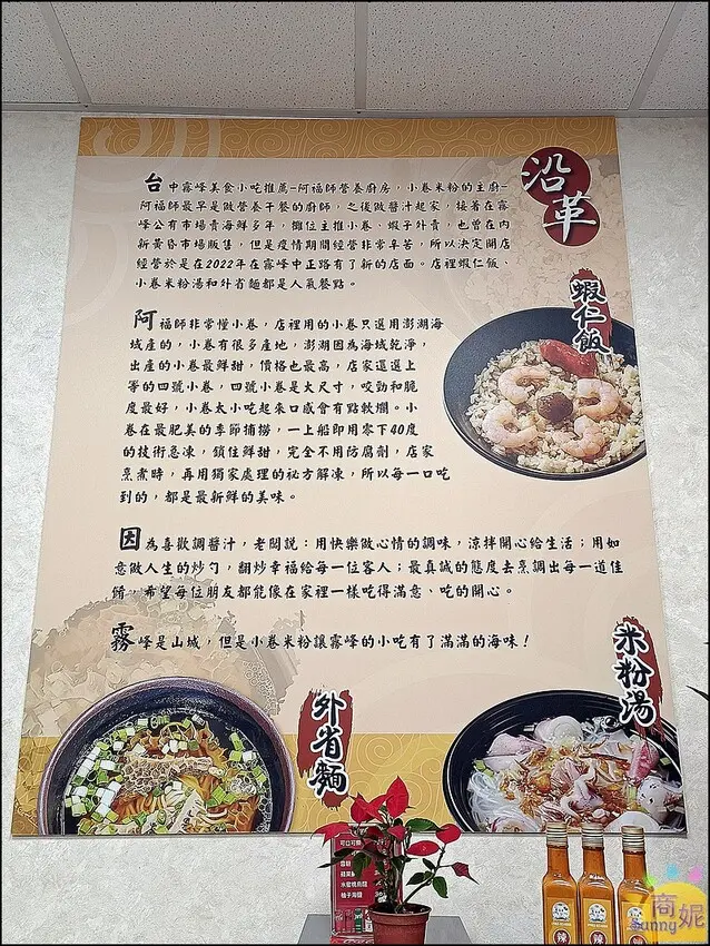 台中霧峰小吃/霧峰小卷米粉/霧峰鮭魚飯/霧峰蝦仁飯推薦!台中好吃小卷米粉推這家~阿福師營養廚房以新鮮好吃的小卷米粉、鮭魚飯、蝦仁飯聞名!用料實在可以吃到鮮甜的海味,內用外帶的人很多用餐時段經常客滿,愛吃小卷米粉的朋友快把這家阿福師收入口袋名單。阿福師在哪裡?阿福師目前有兩家分店我們到最新開幕的樹仁店用餐,位在霧峰樹仁路與四德路口,斜對面振德街農會後方就有收費停車場,交通很便利。阿福師環境新開的樹仁店有內用區空間,大約6桌,用餐時段經常客滿。不想等也可以外帶,出餐速度很快不會等候太久,整個環境乾乾淨淨,還有提供飲水機。牆面上有寫著阿福師的起源沿革。阿福師原本是做營養午餐的廚師,後來做醬汁起家,接著在霧峰公有市場賣海鮮多年生意非常好,於2022年在中正路開了內用店面,蝦仁飯、小卷米粉和外省麵都是人氣餐點,最近又在樹仁路這邊開新分店,兩家店賣的餐點都一樣,分散客源免除排隊等候的時間。餐具沾醬佐料都集中在這一區自助取用。店內的湯頭、醬汁及所有沾醬也都是阿福師自己手工熬煮,吃起來就是跟其他店家不一樣。其中小魚乾辣椒我個人最喜歡,香辣回甘的海味好好吃。我看很多外帶客人都是一包一包裝小魚乾辣椒帶走,通通免費耶~阿福師菜單阿福師菜單餐點種類很多,麵、飯、米粉、麵線通通有,還有各種切盤、藥膳滷味、海鮮、飲料…價位大多是百元上下,從市場超人氣小攤到現在兩家分店,餐點用料實在。阿福師好吃嗎?我們多人用餐,點了招牌的海鮮米粉、蝦仁飯、閹雞肉飯、還有外省麵,再加上一些小菜、切盤,擺滿一桌好豐盛。飲品 阿福師的飲品都是手工製作品質不錯,我們挑了幾款都好喝。像是小葉紅茶選用日月潭紅茶,風味極佳;還有高山冷泡茶也是等級不錯,入口回甘。還有洛神花茶有加了話梅,酸酸甜甜相當開胃。據說桂圓銀耳也很讚,可惜我們今天來賣完了沒有喝到…總匯海鮮米粉 150元小卷米粉是他們家的招牌,總匯海鮮一共有四種海味,是店內人氣第一名。(備註:因為要拍照,我特地請老闆湯給少一點,才看的到食材用料。實際上海鮮湯是加到約八九分滿,一大碗份量十足)總匯海鮮可以選海鮮粥/海鮮麵/海鮮麵線/海鮮米粉,我們愛吃小卷米粉所以選米粉。他們家的米粉是胖米粉,吃起來比較有口感,吸飽湯汁甘甜好吃,搭配小卷及其他海鮮真的很正點。阿福師的小卷只選用澎湖海域新鮮小卷,而且選用上等4號小卷個頭比較大,咬勁和脆度都有口感比較讚!小卷新鮮急凍產地直送,果然味道鮮甜超好吃!真的跟一般麵攤的小卷大不同,吃過就愛上~~總匯海鮮還有大尾白蝦也是肉質飽滿又Q彈,還有鱈魚丸QQ嫩嫩滋味也不錯。最特別的是竟然有鮭魚切片耶~老闆介紹這是挪威鮭魚,應該就是西餐常吃到那種煙燻鮭魚同等級,老闆真的用料不手軟耶~軟嫩的肉質香甜好吃,加上鮮甜的湯汁美味更升級!海鮮湯頭用虱目魚骨加上大骨熬煮,再加上油蔥酥及薑絲提味,味道鮮甜更有層次感超好喝,喝不夠還可以免費加湯喔,老闆真的很佛心!!這碗總匯海鮮米粉料多味美,難怪是店內人氣第一名,大推!!蝦仁飯 70元蝦仁飯有四隻剝好的大蝦仁,新鮮活凍的大白蝦肉質QQ嫩嫩的充滿海味,味道甘甜。這碗蝦仁飯最厲害的是米飯本身,老闆特別選霧峰香米跟長米,用獨家比例加上特製醬汁及紅蔥頭一起拌炒,相當入味粒粒分明,又Q又香卻不會油膩口感特別棒,超好吃!這個香腸也大有來頭~不是一般的鑫鑫腸,而是飛魚卵加上雞腿肉製作的特製香腸,波滋波滋的飛魚卵在嘴裡爆開,加上雞腿香甜的肉汁,真的是越咬越香!!閹雞肉飯 100元阿福師的閹雞肉飯選用台東閹雞,在台中霧峰也能吃到真棒!色澤偏黃的閹雞肉口感子紮實帶有Q度,鹹香入味蠻好吃的。他們家的飯類都是用兩種米加上秘製醬汁拌炒而成,真的很好吃!!光是吃炒飯我個人就覺得值回票價。這碗炒飯主食閹雞肉以及飛魚卵雞腿捲,美味更加分。古早味蔥油拌麵 60元外省麵也是人氣餐點,麵條口感Q彈不會軟爛,靈魂就是秘製醬汁,攪拌後味道特別香!!看似簡單,吃起來就是讚。外省麵還有附一顆丸子,可能是隨機口味,我們這一碗是虱目魚丸,香Q好吃。鱸魚湯 80元鱸魚湯的魚肉都是大塊的菲力部位,鱸魚湯用料真的不手軟。鱸魚也是新鮮活凍的,肉質軟嫩帶有Q度,不會粉粉的,一吃就知道非常新鮮,完全沒有腥味!除了鱸魚肉還有一顆鱈魚丸,湯頭充滿膠質,平時要進補來這裡點鱸魚湯就對了。綜合魚丸湯 40元綜合魚丸湯有香菇貢丸、虱目魚丸以及鱈魚丸,三種海味一次滿足!他們家湯頭都是用虱目魚骨加上大骨熬煮,非常甘甜好喝,尤其是有加了油蔥酥味道特別香。蝦&小卷切盤 300元阿福師的海鮮切盤有小卷、白蝦、以及鯊魚煙,我們點白蝦和小卷的綜合切盤。澎湖新鮮活凍小卷產地直送,味道真的很鮮甜!!所謂「新鮮就是王道」,燙煮後的小卷口感Q帶點脆度及咬勁,沾店家自製的五味醬就很好吃。白蝦也很新鮮,個頭大肉質飽滿又結實,川燙就是最佳美味。鮭魚盤 100元挪威鮭魚直接刨成長條鮭魚片,完全無刺口感非常軟嫩,帶有飽滿的鮭魚油脂味道超甜,這個小朋友超愛!我們吃過就愛上,大推~~藥膳牛肚牛腱 150元這個滷味是阿福師祖傳中藥秘方,足足用13種中藥滷出來的!藥膳牛肚及牛腱非常入味,吃起來完全不會油膩。牛腱選用精華部位牛腱心,口感嫩帶點Q度越咬