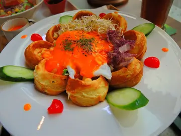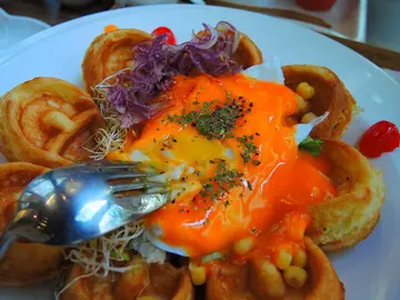 Dear Diary:漸漸的踏入了 秋季。這幾天 Yoyo 的生活步調一整個緊繃到不行,吃飯也不正常~結果腸胃消化不良了啦!嗚嗚 )) ~~ 在昨日的下午,騎著機車和 B 先生來到了位於「斗六市民生南路」上的「柚子館」。外觀建築非常奇特,很難不去注意到它呢。 近看~ 根本就像個小公園似的。就在 <寶雅> 的對面喲! 因為地大的關係、所以常有一些 活動 會在這裡 搭棚舉辦。為純樸的斗六帶來一絲熱鬧的氣息~ 有提供戶外的坐椅、天氣好時不妨來外頭這邊透氣、呼吸一些 芬 多 精 餐廳的名字叫 「樂輕食」 踏入裡邊, 不採用冷氣、純屬自然風雨電扇~ 美式鄉村風格 的吧台,黑板上寫了餐點的價格與名稱。 還有提供茶水給顧客飲用~ 旁邊的 乾燥花 真是美麗。 這隻大熊好可愛~ 拿著一束花 ... 嗯~ 給 Yoyo 的嗎? 這邊有四人坐的桌椅~ 蛋糕 展示櫃、果汁、酒類 ~ 好多手做蛋糕,下次一定要來試試看。 冰淇淋櫃,是 莫 凡 彼 的喲! (( 後面那台 除草機 也太搶眼了吧!)) 哈哈 這裡有販售 茶包禮盒 哦! 這裡是 Yoyo 和 B 先生的挑選的坐位~ 是不是看起來超舒適的!!! 哈哈 ~ 牆壁上可愛的擺飾鐘。 「樂輕食」的點餐單。種類繁多、飲品 與 點心、還有 主餐 喲! 凡主餐加 $ 100 即可 附贈沙拉、飲料 ~ 挺划算的呢! B 先生點的 「美式脆薯」 $ 60 還有附上 蜂蜜芥末醬、番 茄 醬 ~ 薯條炸的酥脆、還帶有點 鹹酥雞 的味道耶! 主餐加購 $ 100 附贈的 「鮮奶青茶」 Yoyo 的 「凍檸紅茶」 $ 60 微糖非常道地的好喝!有新鮮檸檬的鮮榨 酸 味,還有紅茶微甜的回甘甜味。搭配在一起真的 清爽又解渴 呀! 附贈的 「培根沙拉」 ~ 搭配 油醋醬 沙拉新鮮翠綠、培根 則是煎的 外皮焦脆、肉質卻又 香嫩。淋上油醋醬一口一口超滿足的啦!膳食纖維 都補足了呢~ B 先生點的 「奶油培根義大利麵」 $ 130瞧瞧那盤子,大的咧! 哈哈 不要看那少少的表層、其實盤子是有點 深度 的。培根 給的依然很大方、厚實又香脆~ 時蔬 也不少喲!而且麵條 Q 硬的程度剛好重點 奶油白醬 的基底調的 濃郁溫順,完全包覆住麵條呼嚕下去既能吃到香濃奶油的滋味、又能嚼出 培根鹹香 的味道,搭配的天衣無縫啊! Yoyo 點的 「班尼迪克起司鬆餅」 ( 花造型 ) $ 150物超所值啊!鬆餅的厚度先不提、上面除了一顆 水波蛋 以外、底下則是鋪滿了 生菜沙拉、最後還淋上了特製 香濃蛋黃 打製的 荷蘭醬,清香略鹹、完全不會膩口!若是荷蘭醬不夠的朋友、店家有另外 附贈一杯 給您唷 !!! 看看那厚實的又嫩又脆的鬆餅~ 噗滋 ... 有沒有看到這樣刺破後 ...那湧出 金色耀眼 的 蛋液?. . . . 看不清楚沒關係、再來個 性感的特寫。 XDD 亮眼細緻、黃澄澄的 蛋汁 就這樣 春 心 蕩 漾 般的緩緩溢出來 ... 好過癮的畫面啊! 悠閒、緩慢 的 「樂輕食」 ...讓大家放鬆的慢下步伐,沉靜享受美食陪伴的每一刻。…Read More
