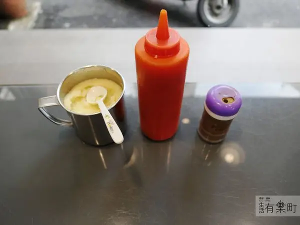 桌上擺了調味料,有辣醬和蒜泥,加在米糕或碗粿上感覺都很適合~