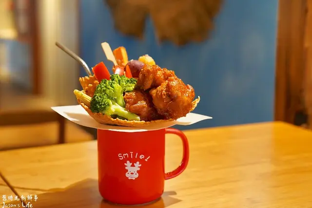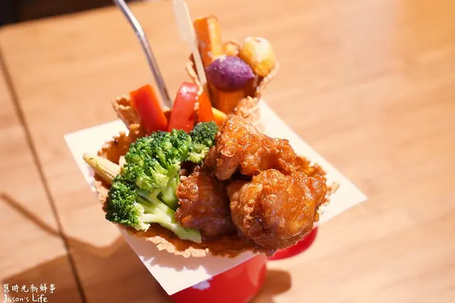 利用餅皮當做盛裝器具,把沙拉和炸雞、薯條、QQ蛋堆疊在餅皮上