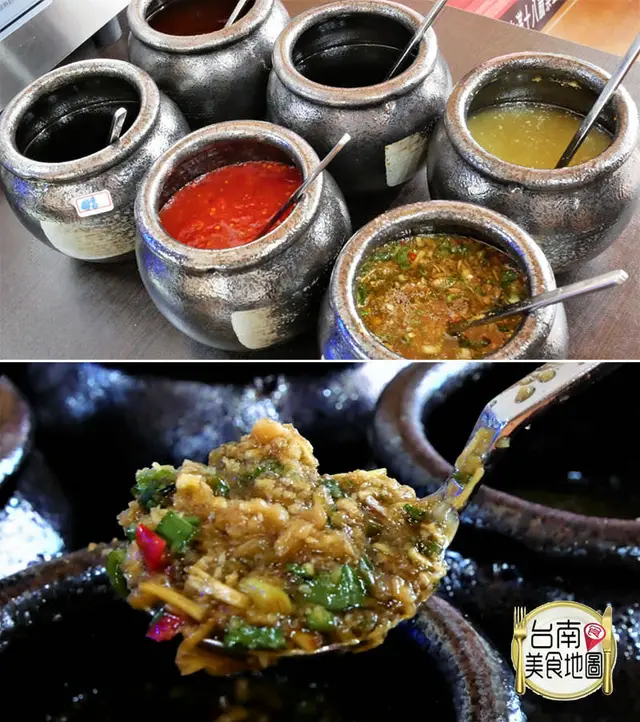 ▲店內供應6種調味醬,其中一款用蔥、薑、蒜、香菜、辣椒等等特調的風味醬,拿來沾海鮮很對味喔٩(๑^ 3 ^๑)۶