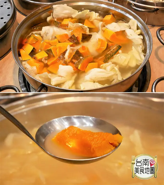 ▲自熬的火鍋湯底,上層可以放上一籠籠的鮮魚清蒸,各式蒸熟的鮮魚精華即滴落在這火鍋裡~ 高麗菜和南瓜的清甜,讓整鍋湯頭喝來是即鮮又甜!