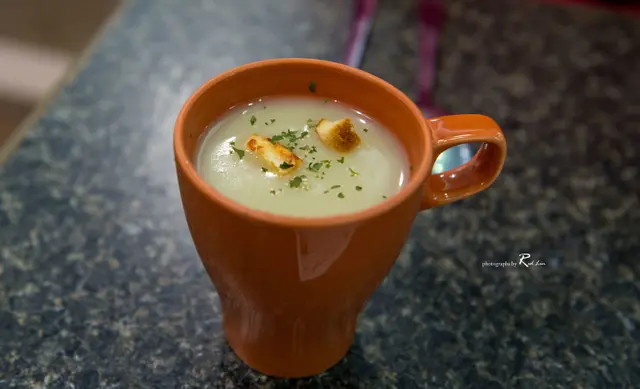 今日的湯品是玉米濃湯,口味香濃,喝起來濃稠度也夠,好喝,不過用杯子裝還蠻特別的~