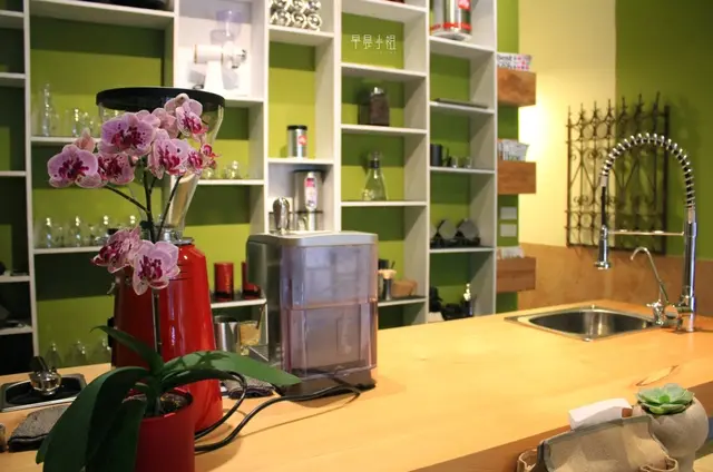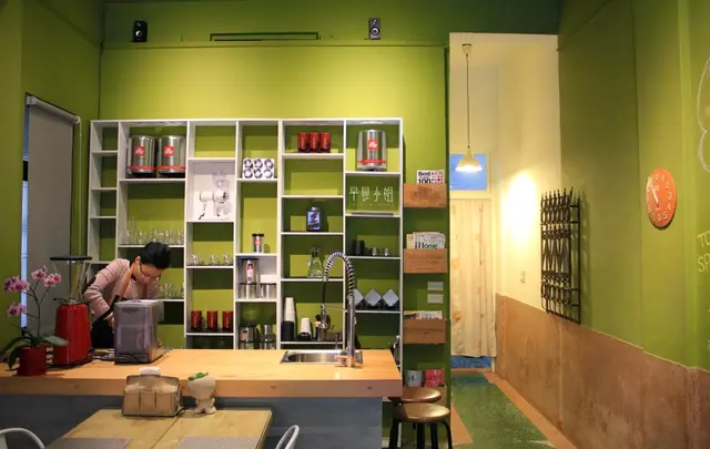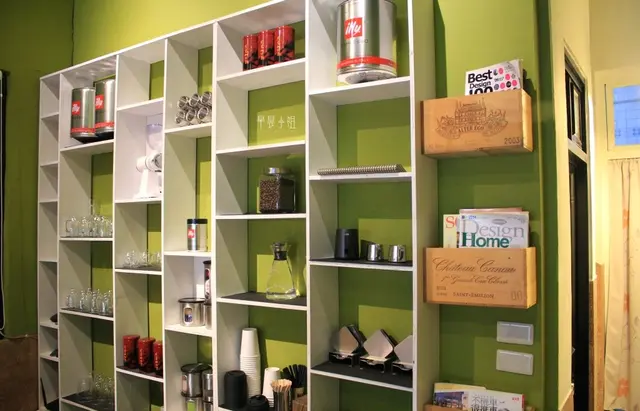 白色的層架搭配上蘋果綠的牆面 色調相當輕柔