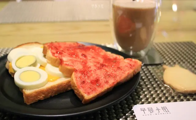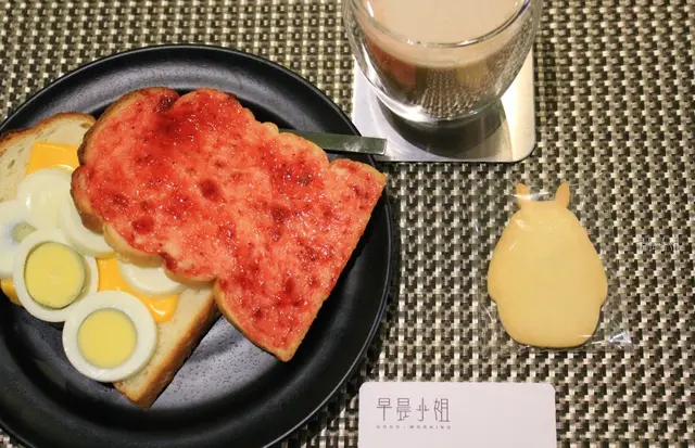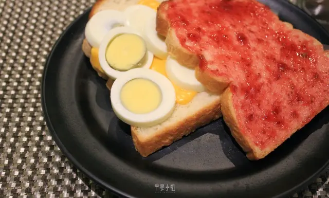 以吐司 起司 切片水煮蛋 以及草莓抹醬所組成