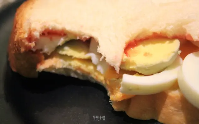 草莓醬的酸甜卻不會太過於搶味 水煮蛋的蛋白相當彈 為內餡主要的口感來源