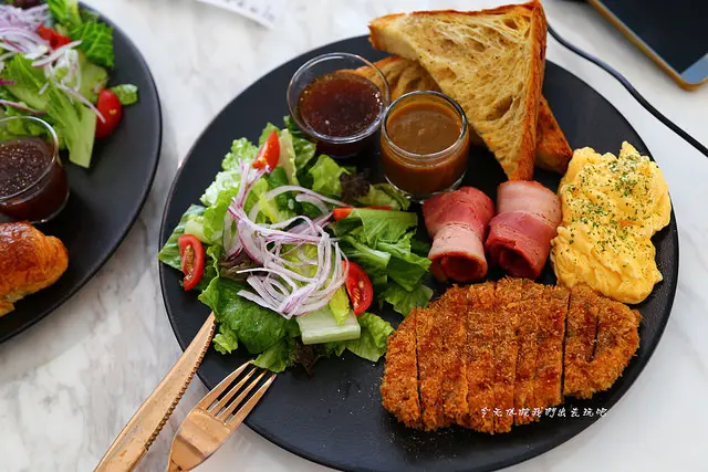 厚切豬排.培根.鮮奶蛋.香蒜吐司.沙拉
