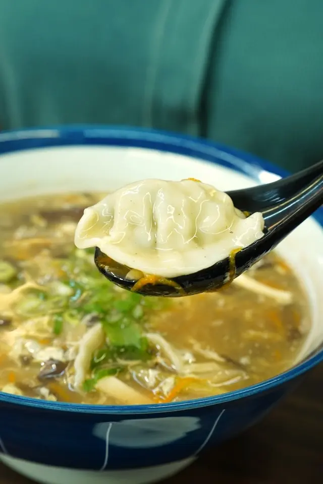 ▼酸辣湯餃!他的酸辣湯是有放豬血的傳統做法,現在很多都只放木耳而已!湯餃內餡飽滿,每個頭好壯壯,大顆滿意!