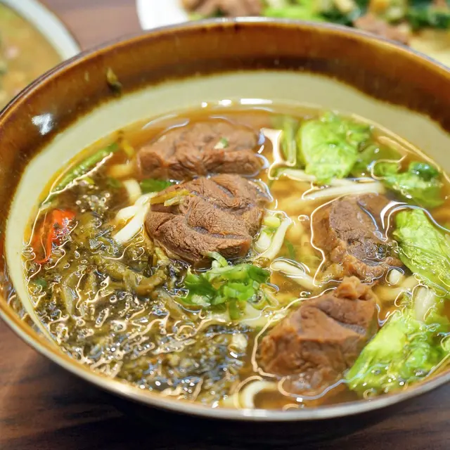 牛肉是牛腱心的部位,燉煮得軟嫩入味,但因為有厚度所以不會失去肉塊的口感!牛筋吃起來也是QQ糯糯,是會讓人記住的味道。湯頭喝起來甘醇爽口,反而沒有很重的中藥味也不會辣,搭配酸菜更添風味,配上Q彈的麵條,簡直是冬天裡的最佳享受!