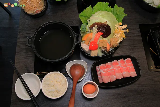 整個就比外面的小火鍋精緻許多,一整組有著基本菜盤、梅花豬肉片、有機土雞蛋、白飯。