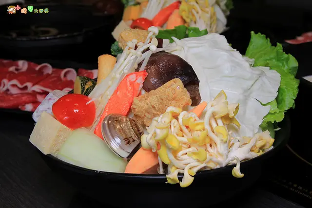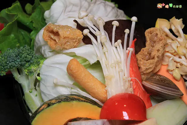 非常豪邁的菜盤就這樣滿出來,裏頭有著 蔬菜>火鍋料,還點綴著菇類。