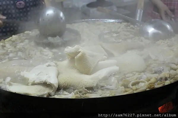 大鍋旁放了許多當天所宰殺的新鮮食材