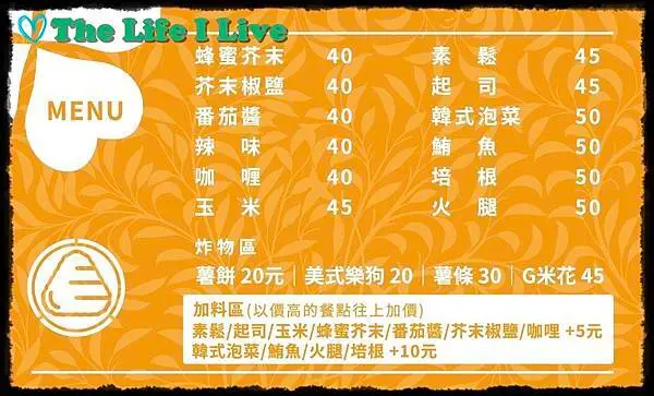 韓式泡菜、鮪魚、火腿、培根+10元,