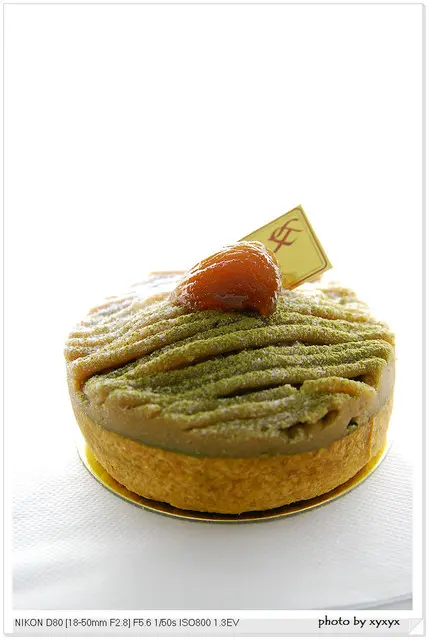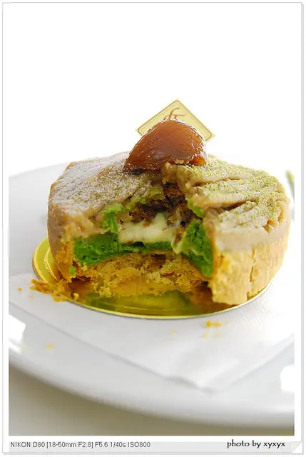 上層是栗子蒙布朗,內餡是抹茶,中間是白色的奶油餡 Mascapone幕斯..