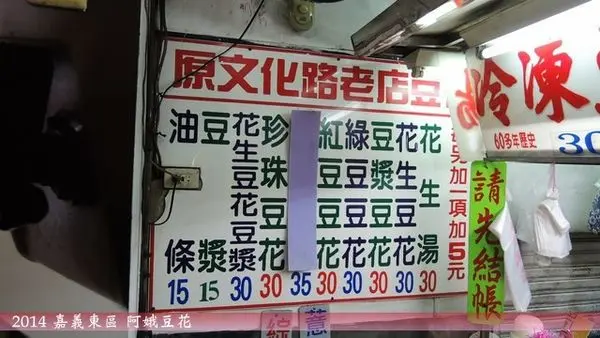 看了網路很多人推薦,來文化路必吃甜點。現場到了店面也是很多人在吃,還好豆花翻桌率高不用等太久就有位置。這邊的價格平實,一料加豆花30元,跟北投價格差不多。嘉義的豆花有個特色,就是湯底式豆漿,這在北部的豆花店比較少見。所以住北部沒吃過豆漿豆花的可以來品味一下南北不同口味的豆花喔!