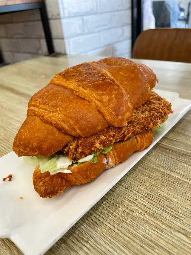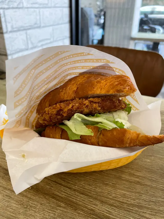 「日式炸豬排可頌」也就是「日式炸豬排牛角包」,這道餐點同樣令人驚豔。炸豬排外皮酥鬆香脆,肉質軟嫩入味,搭配牛角包的酥脆層次,整體風味完美融合,即使獨自享用一整個也不會感到膩口。