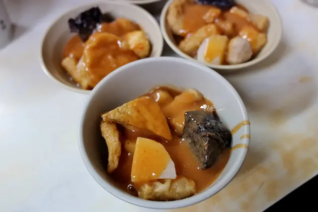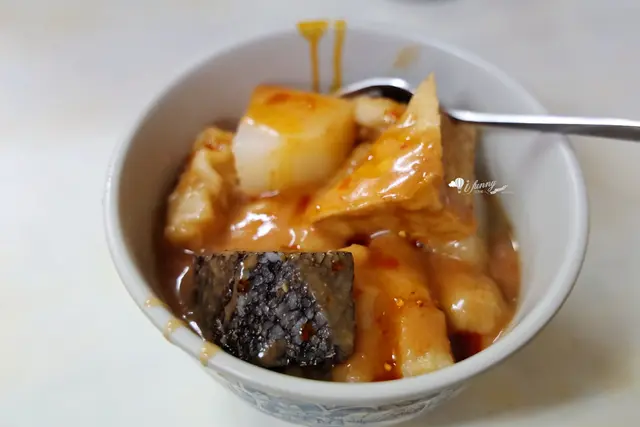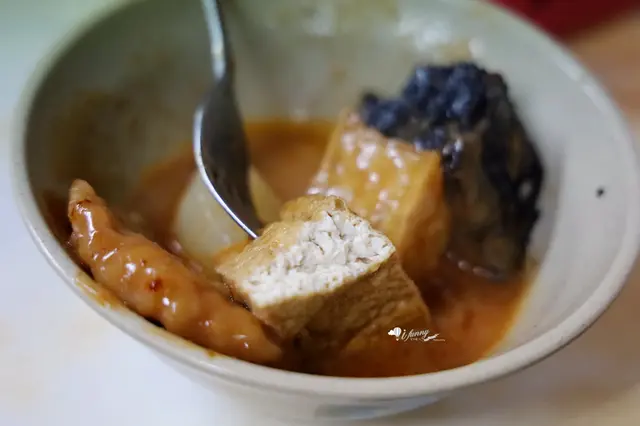 太久沒吃了,因此點了份大碗的,甜不辣條、豆腐、蘿蔔都是比小碗多了數量的。甜不辣醬是用味噌醬、甜麵醬、甜辣醬…等十多種配料調製而成,帶有點花生醬香又有點甜甜的香氣,另外一定要加桌上特製的麻香辣椒油,這樣才更過癮!不過有點辣,不敢吃辣的朋友得小心!
