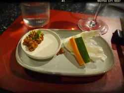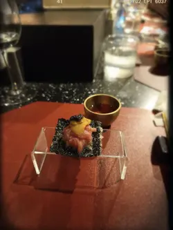 每位席上都擺有自用嘅餐具。廚師發辦嘅「無菜單料理」用上當日最新鮮嘅食材烹調,分NT1,500/位(豬肉x海鮮)及NT,2500/位(牛 x海鮮)兩款,菜單大約每三個月換一次。