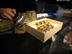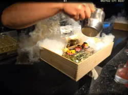 冇幾耐,歐巴好有儀式感地為色彩鮮艷嘅生牛肉海膽脆脆即場製造出煙霧迷漫嘅仙境