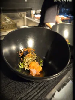 去到中段,師傅好興奮咁介紹鎮店招牌拌飯。拌飯用上海苔醬醃出,配料除咗肉眼睇得到嘅三文魚刺身、魚籽醬、炸菇絲之外,其實仲有芬芳嘅紫蘇油,當真色香味俱全