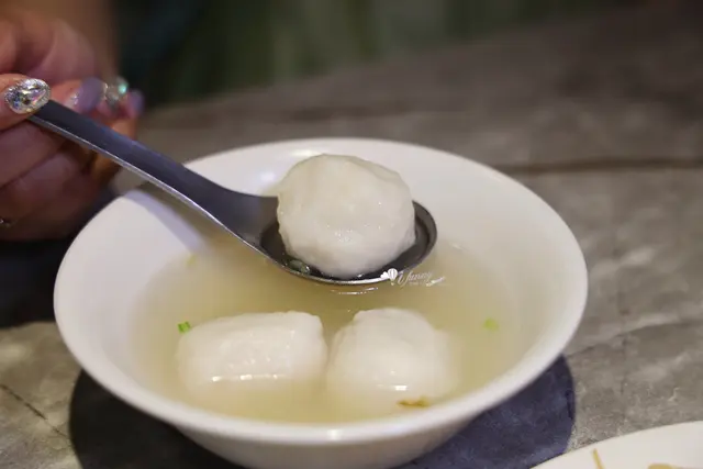 永富魚丸店的福州魚丸,是採用上等的鯊魚去除紅肉的清肉製成魚漿,內餡則是採用豬後腿肉,加入宜蘭三星蔥、古法釀製醬油膏、冰糖,雞骨高湯精製而成,再以手工魚漿包起,成了白拋拋的魚丸。要留意福州魚丸會爆汁,不要一大口吃掉,小心被燙到。咬下後外皮很Q彈,內餡鮮甜且不油膩,而且完全沒腥味,真的是目前吃到最好吃的福州魚丸之一。