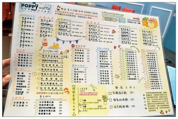 poppywaffle比利時列日鬆餅就在員林大同路上 這家的餐點很特別有火鍋有鬆餅. 簡直又是中西合併 如果今天想要多重選擇 就來這兒吧 ! 大同路黃昏市場對面有著顯眼的藍色門面就是比利時鬆餅了 店內清新高雅且不失鄉村田園氣質的輕鬆氛圍 讓明亮且舒適的用餐環境,更易讓人放鬆其中 一樓吧檯 飲料及鬆餅都是在這做 都是現點現做 二樓用餐環境 相傳於18世紀中葉,一名位於比利時列日城王子─Bishop, 因厭倦傳統奶油蛋捲早餐,因此特地要求御廚準備不同以往的嶄新餐點 御廚花費心思,試著在漫長時間發酵的麵糰裡,添加白色珍珠糖,使鬆餅飄逸出迷人香氛且甜而不膩的口感 如此幸福的滋味鬆餅就叫做─「Gaufre de Lie'ge列日鬆餅」! 魚腥草養生鍋$280 素食香菇高湯+魚腥草 光聽名字就覺得很養生 魚腥草沒記錯的話在夏天是青草茶的原料之一(具有清熱、解毒、利濕的作用) 竟可用在火鍋上.覺得特別 而且湯頭喝起來沒有很嗆的腥味 有蝦有肉有蔬菜這樣的份量一個人剛好 有趣的是蛋上面還畫有表情圖案(覺得驚奇) 煮好了.準備享用 普羅旺斯嫩煎雞肉義大利麵$179 醬料有白醬.紅醬.青醬. 青醬是我的最愛.我是每店必點 煎過的雞肉很嫩.味道也夠 麵條的味道淡了些 因該是湯汁還沒完全吸附 繽紛樂園(季節限定)$100 鬆餅上擺著多種水果.藍莓跟草莓都是季節限定的水果 其實我是被藍莓吸引的 香蕉為第二層.在放在季節水果淋上鮮奶油及草莓醬 也是吃鬆餅的另一種享受 燻雞起司$60 烈日鬆餅搭著燻雞 有著另一種風味 燻雞下的起司.更提升了鬆餅的味道 盤子旁的小腳印 覺得好可愛 新鮮水果茶$90 以多種柑橘類水果為基底,佐以時令鮮甜水果.絕不使用濃縮果汁的自然原味 喝起來時酸酸甜甜 飯後來喝很適當剛好可以解膩 如果只是來下午茶.搭著鬆餅一起吃也不錯 原味拿鐵$70 點餐時還特地問服務人員 我要立體拉花那種.要點哪一系列的才有 就點了原味拿鐵.喝起來奶跟咖啡搭配得剛剛好 不會顯得有過多的奶味.不錯喝 整體來說價位很廣從$40~$280均有 看你今天想要怎麼用餐或者下午茶 食材來講都很新鮮. 水果茶也採用了大量水果.很實在 下午茶時段14:00~17:00 店家有鬆餅套餐搭配.鹹的甜的覺得都不錯 義大利麵.燉飯.養生鍋物及立體拉花咖啡 值得去探索一下美食喔~~ …查看更多