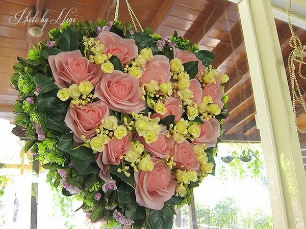 玻璃小屋內有許多用玫瑰做成的愛心裝飾