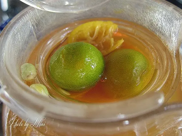 熱桔茶加入了桔醬、金桔汁、紅茶所調和而成,裡面還有加入新鮮的小金桔子