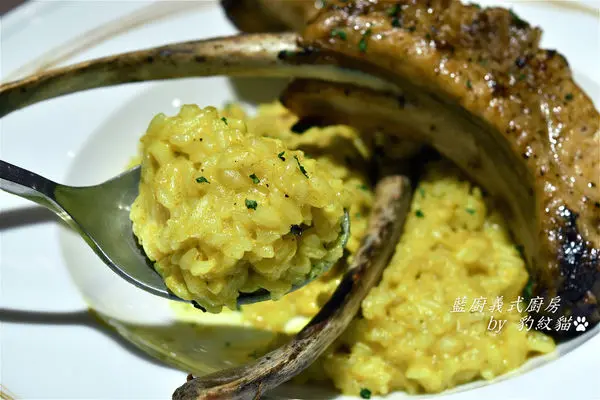 瑰麗又霸氣的燉飯一上桌,不禁暗自驚呼。金黃亮眼的米飯,頂著兩支個頭不小的豬肋排,在其他地方要吃到這種料理,通常荷包會小失血,【藍廚義式廚房】卻是300元有找。