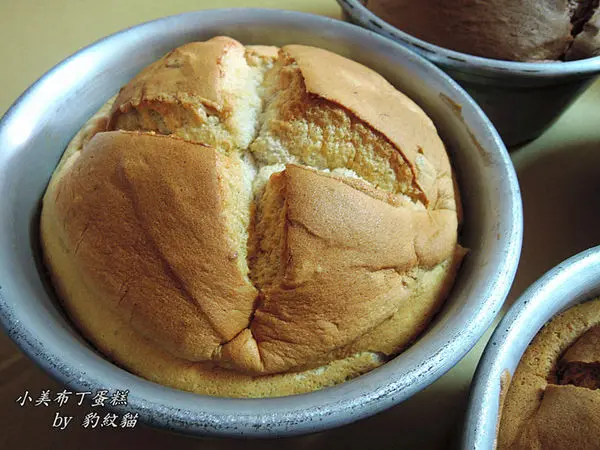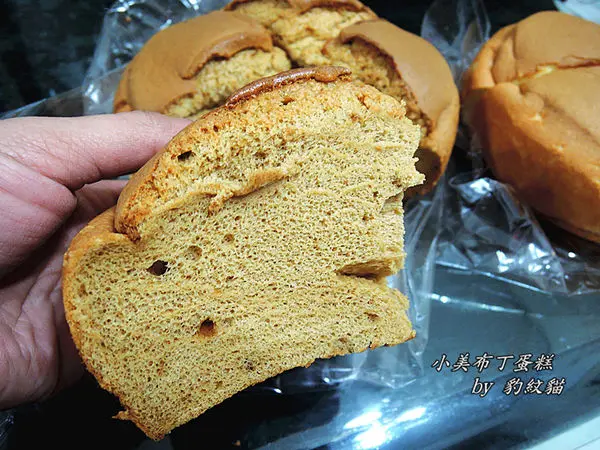 【小美布丁蛋糕】用料很實在,也不添加其他奇怪的香料,烤好的外觀,很像開口笑的戚風蛋糕。蛋糕體吃起來扎實帶濕潤,濃濃的麥香、蛋香,在嘴中不斷迴盪。看似不起眼,卻是會不知不覺地把它吃光,魅力無法擋。